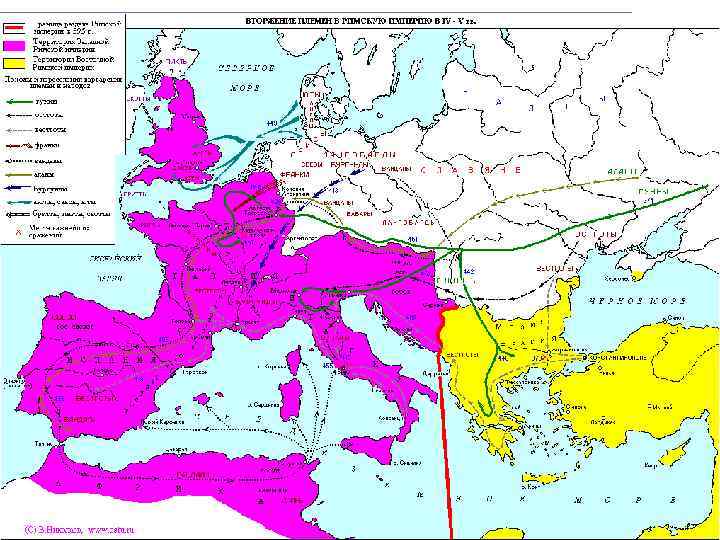 Упадок Римской империи l l l 378 г. – битва при Адрианополе. Разгром готами римской армии, убийство императора Валента. 395 г. – раздел Римской империи на Западную и Восточную (позднее Византийская империя). 410 г. – разгром Рима готами ( «Покорен город, которому покорялась земля» ). 451 г. – битва на Каталаунских полях. Разгром армии гуннов и их царя Аттилы. 455 г. – разгром Рима вандалами, варварское разграбление Рима. 476 г. – захват Рима германцем Одоакром, свержение последнего римского императора Ромула Августула, отсылка его регалий в Константинополь. Западная Римская империя перестала существовать.