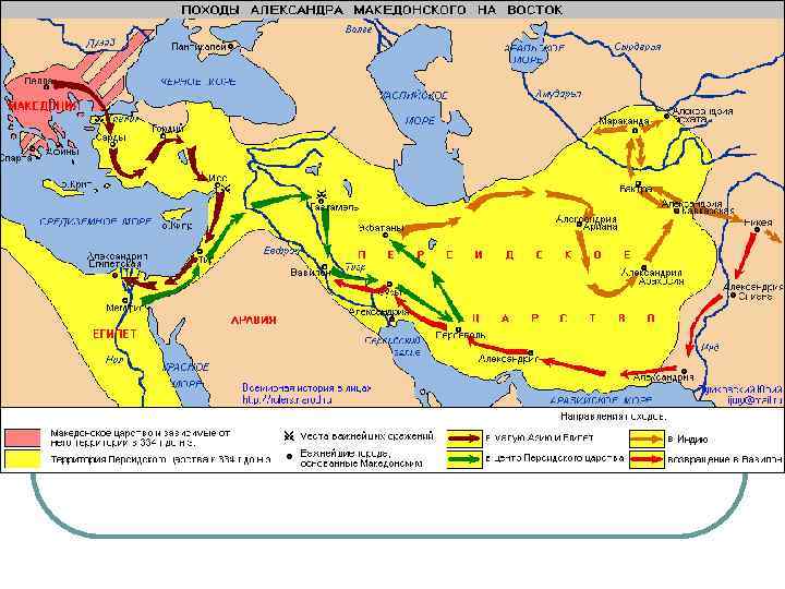 Походы Александра Македонского l Битва при Иссе – захват Финикии, Сирии, без боя – Египта; l Битва при Гавгамелах – разгром Дария, вскоре он погиб; захват столицы Персеполя и его сожжение; вторжение в Индию