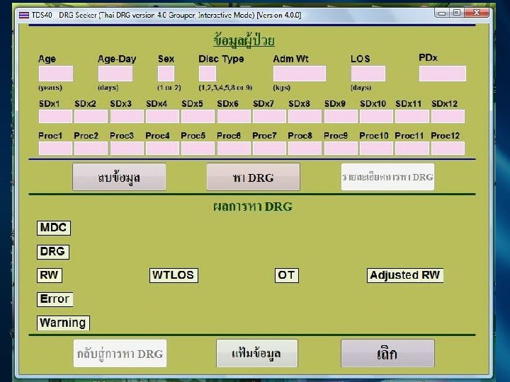 ขอม ลในการจดกลม Thai DRG • โรคหลก • การวนจฉยอนๆ ICD-10 • โรคแทรก (Complication) • โรครวม (Comorbidities) • การผาตดและหตถการ ICD-9 -CM (Procedure) • อาย • สถานภาพการจำหนายผปวย • จำนวนวนนอน รพ. (Admit/Discharge/Leave day) • นำหนกเดกแรกเกด (แรกรบ )