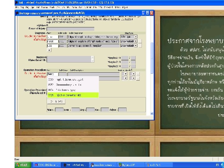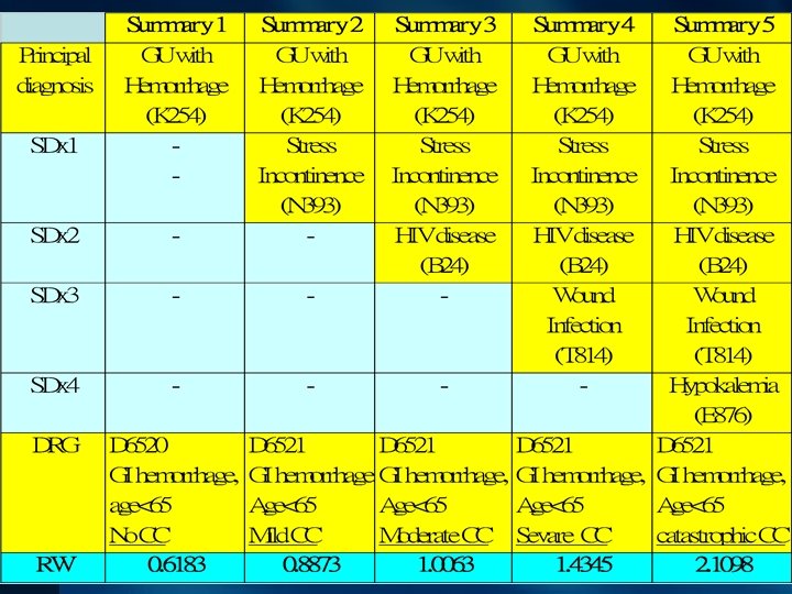 ผลของการไมสรปหตถการ ไมสรป Principle Dx สรป Gastric ulcer with hemorrhage(K 254) 06520 GI hemorrhage, Partial gastrectomy with gastrojejunostomy (43. 7) 06020 stomach, Esophageal Secondar y DX procedur e DRG