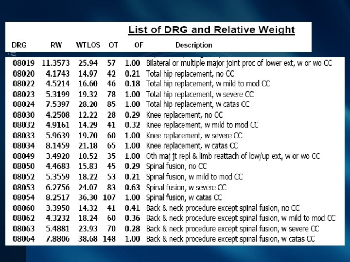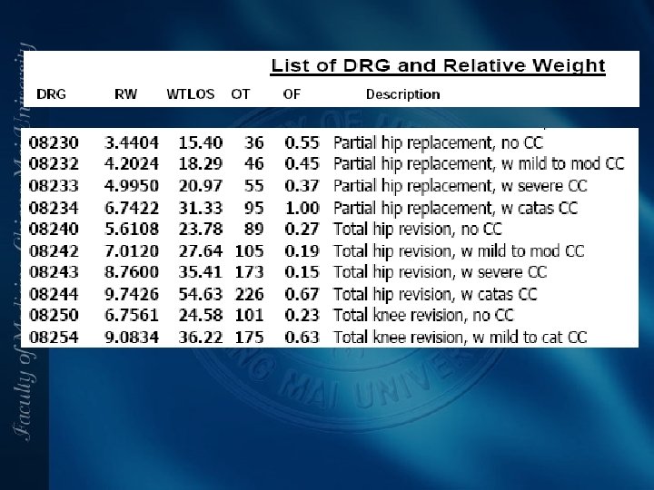 องคประกอบของ DRGs • • • ความหนกเบาของการเจบปวย การทำนายผลการรกษา ความยากงายของการรกษา ความจำเปนในการผาตดรกษา ความตองการใชทรพยากรโรงพ ยาบาล