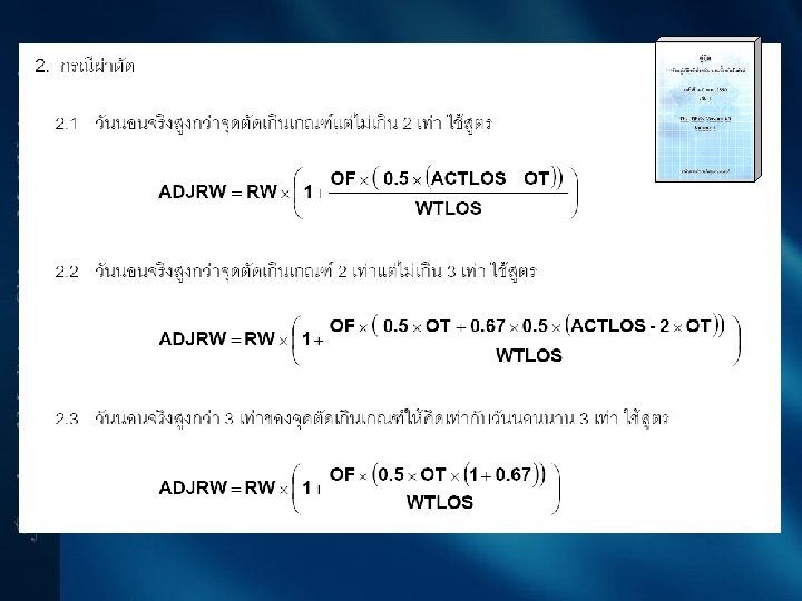 Adjusted RW (Adj. RW) • คานำหนกสมพทธทปรบตามวนนอ น (LOS) • Medical กบ Surgical DRGs ใชสตรตางกน • Low outliers มสตรไมเทากนในแตละวน • High outliers มสตรตางกนเปนชวงเวลาทยาวขน