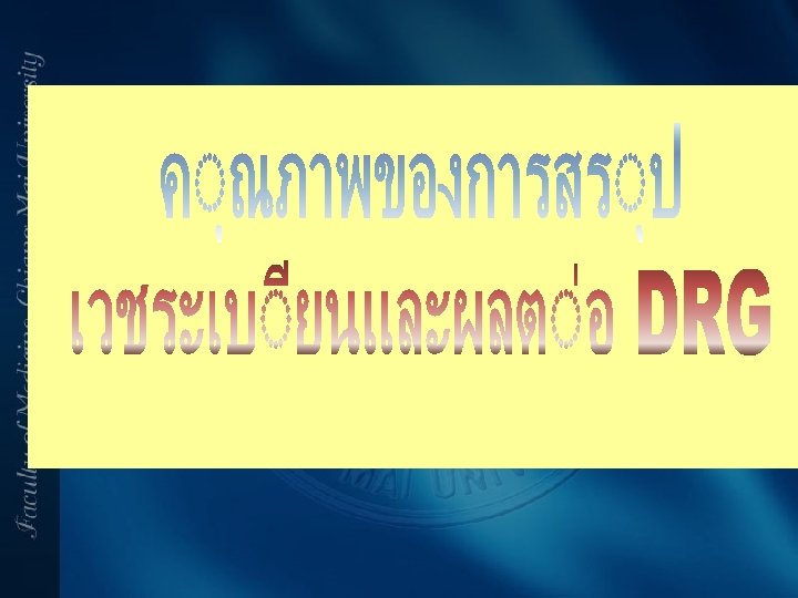 DRG • การจดกลมโรคทมความรนแ รงและใชทรพยากรใกลเคยงก นเขาเปนกลมเดยวกน • ใชเปนเครองมอในการจดสรรเ งน การจายเงนและการประเมนผลงา นการจดบรการของโรงพยาบาลแล ะแพทย • การสรางมาตรฐานการคดคาบรก