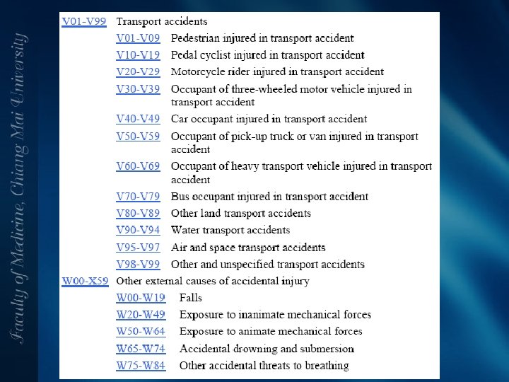 EXTERNAL CAUSES OF INJURY • ระบกลไก หรอสาเหตททำใหผปวยบาดเจ บ ใชภาษาไทยกได • เชน Fall from tree หรอตกตนไม , ขบรถยนตชนรถบรรทกสบลอ , ซอนรถมอเตอรไซดชนทายรถปกอ พ • กรณไดรบพษ ใหระบดวย วา เปนอบตเหต หรอ จงใจทำรายตวเอง • เปนขอมลทไดจากการซกประวต ผปวย หรอผพบเหนเหตการณ
