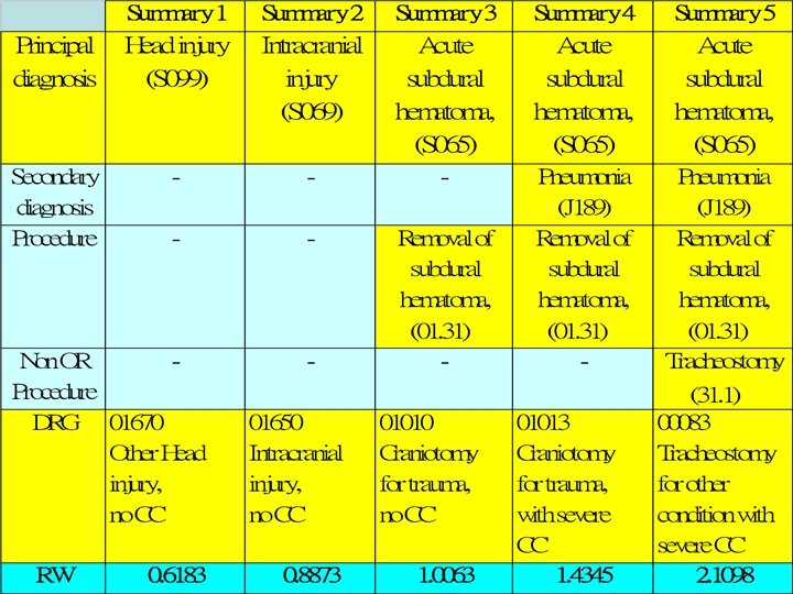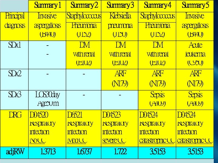 Case hemodialysis sum 1 sum 2 sum 3 Pdx N 179(Acute renal failure SDx 1 J 156 SDx 2 A 415 SDx 3 J 960 3395(hemodialysis) Proc 1 Proc 2 9672(Mechanical Ventilation) Proc 3 311(Tracheostomy) LOS 87 87 87 adj. RW 11. 8 33. 59 DRG 11504 renal failure c catastrophic CC 00104 Tracheostomy c mv>96 hr catastrophic CC