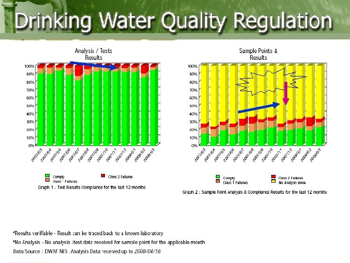 DWQM Compliance • Regulation 5 under Section 9 of the Water Services Act of 1997: – Suitable Monitoring Programme; – Compare Results to SANS 241: 2006; – Respond and Communicate. • Regulation 2834 Water Act 1985 Requirements: – Skills required per class of works. • Section 62 of Water Services Act of 1997: – Performance must be reported to the Minister.