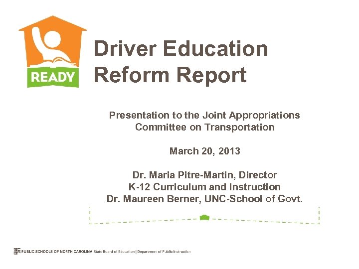 Driver Education Reform Report Presentation to the Joint Appropriations Committee on Transportation March 20, 2013 Dr. Maria Pitre-Martin, Director K-12 Curriculum and Instruction Dr. Maureen Berner, UNC-School of Govt.