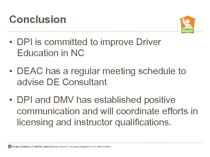 Conclusion • DPI is committed to improve Driver Education in NC • DEAC has a regular meeting schedule to advise DE Consultant • DPI and DMV has established positive communication and will coordinate efforts in licensing and instructor qualifications.