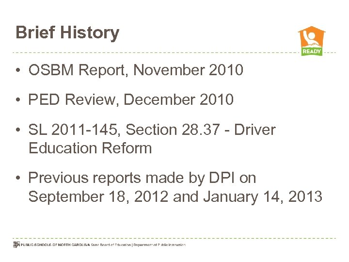 Brief History • OSBM Report, November 2010 • PED Review, December 2010 • SL 2011 -145, Section 28. 37 - Driver Education Reform • Previous reports made by DPI on September 18, 2012 and January 14, 2013