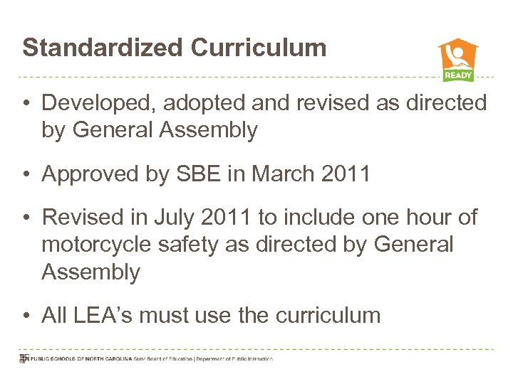 Standardized Curriculum • Developed, adopted and revised as directed by General Assembly • Approved by SBE in March 2011 • Revised in July 2011 to include one hour of motorcycle safety as directed by General Assembly • All LEA’s must use the curriculum