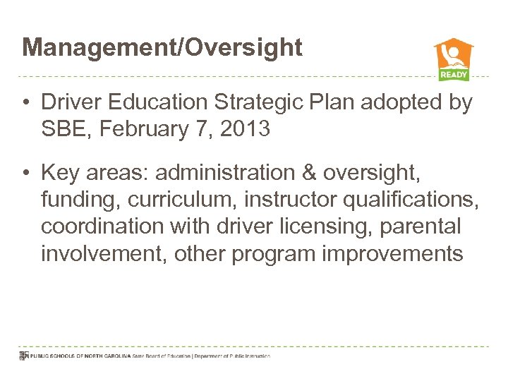 Management/Oversight • Driver Education Strategic Plan adopted by SBE, February 7, 2013 • Key areas: administration & oversight, funding, curriculum, instructor qualifications, coordination with driver licensing, parental involvement, other program improvements