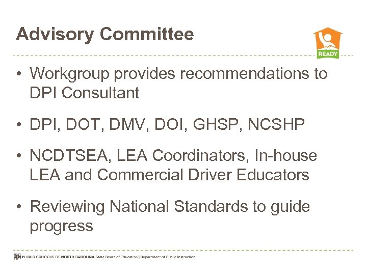 Advisory Committee • Workgroup provides recommendations to DPI Consultant • DPI, DOT, DMV, DOI, GHSP, NCSHP • NCDTSEA, LEA Coordinators, In-house LEA and Commercial Driver Educators • Reviewing National Standards to guide progress