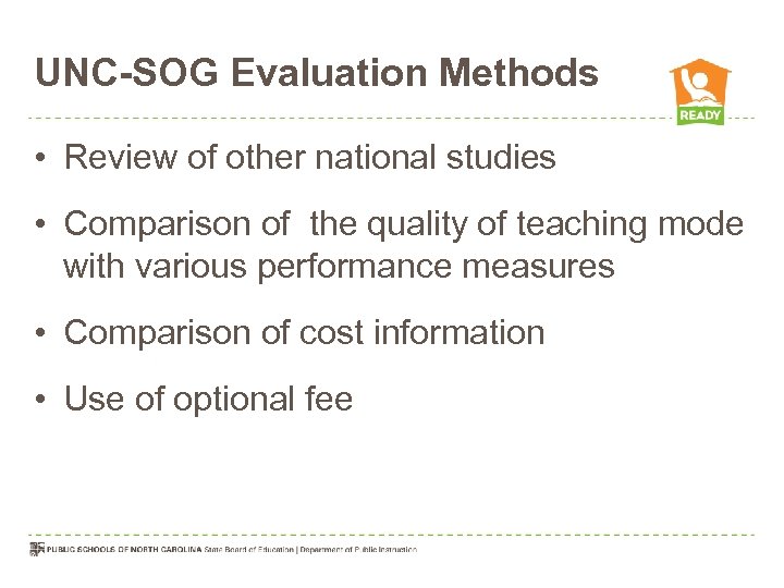 UNC-SOG Evaluation Methods • Review of other national studies • Comparison of the quality of teaching mode with various performance measures • Comparison of cost information • Use of optional fee