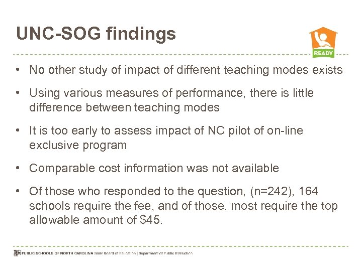 UNC-SOG findings • No other study of impact of different teaching modes exists • Using various measures of performance, there is little difference between teaching modes • It is too early to assess impact of NC pilot of on-line exclusive program • Comparable cost information was not available • Of those who responded to the question, (n=242), 164 schools require the fee, and of those, most require the top allowable amount of $45.
