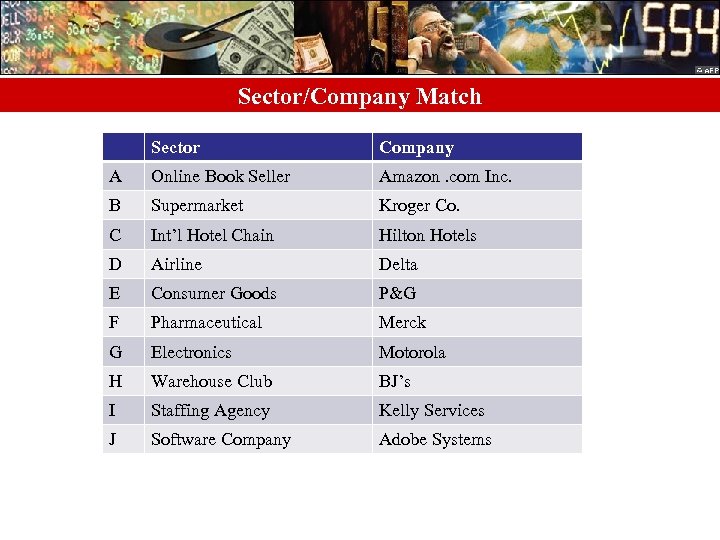 Sector/Company Match Sector Company A Online Book Seller Amazon. com Inc. B Supermarket Kroger Co. C Int’l Hotel Chain Hilton Hotels D Airline Delta E Consumer Goods P&G F Pharmaceutical Merck G Electronics Motorola H Warehouse Club BJ’s I Staffing Agency Kelly Services J Software Company Adobe Systems