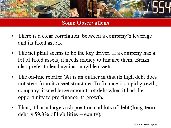 Some Observations • There is a clear correlation between a company’s leverage and its fixed assets. • The net plant seems to be the key driver. If a company has a lot of fixed assets, it needs money to finance them. Banks also prefer to lend against tangible assets • The on-line retailer (A) is an outlier in that its high debt does not stem from its asset structure. To finance its rapid growth, company issued large amounts of debt when it had the opportunity to pre-finance its growth. • Thus, it has a large cash position and lots of debt (long-term debt is 59. 3% of liabilities + equity). © Dr. C. Bulent Aybar
