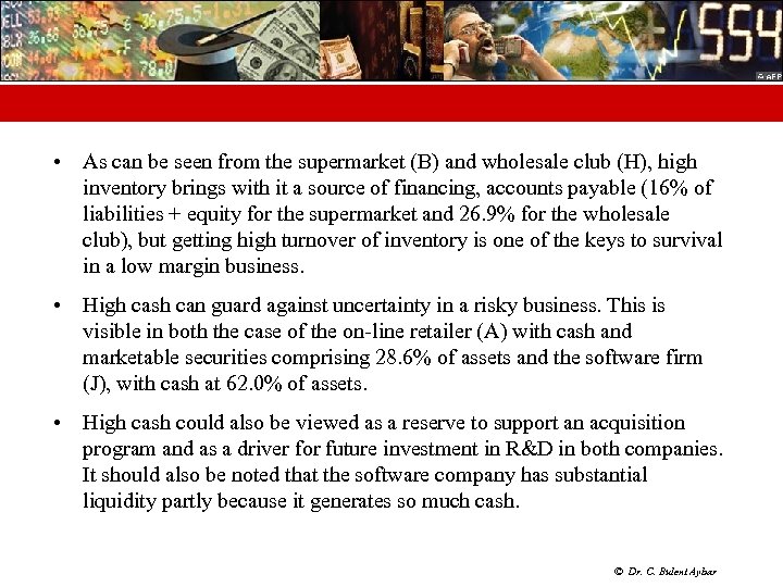 • As can be seen from the supermarket (B) and wholesale club (H), high inventory brings with it a source of financing, accounts payable (16% of liabilities + equity for the supermarket and 26. 9% for the wholesale club), but getting high turnover of inventory is one of the keys to survival in a low margin business. • High cash can guard against uncertainty in a risky business. This is visible in both the case of the on-line retailer (A) with cash and marketable securities comprising 28. 6% of assets and the software firm (J), with cash at 62. 0% of assets. • High cash could also be viewed as a reserve to support an acquisition program and as a driver for future investment in R&D in both companies. It should also be noted that the software company has substantial liquidity partly because it generates so much cash. © Dr. C. Bulent Aybar