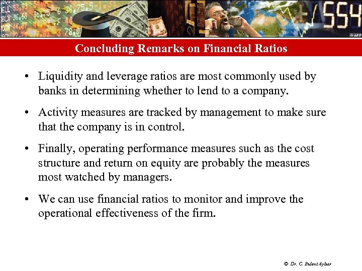 Concluding Remarks on Financial Ratios • Liquidity and leverage ratios are most commonly used by banks in determining whether to lend to a company. • Activity measures are tracked by management to make sure that the company is in control. • Finally, operating performance measures such as the cost structure and return on equity are probably the measures most watched by managers. • We can use financial ratios to monitor and improve the operational effectiveness of the firm. © Dr. C. Bulent Aybar