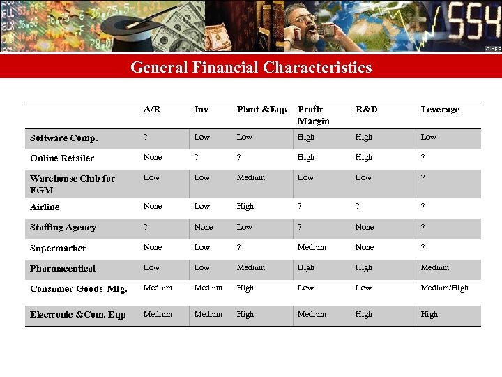 General Financial Characteristics A/R Inv Plant &Eqp Profit Margin R&D Leverage Software Comp. ? Low High Low Online Retailer None ? ? High ? Warehouse Club for FGM Low Medium Low ? Airline None Low High ? ? ? Staffing Agency ? None Low ? None ? Supermarket None Low ? Medium None ? Pharmaceutical Low Medium High Medium Consumer Goods Mfg. Medium High Low Medium/High Electronic &Com. Eqp Medium High