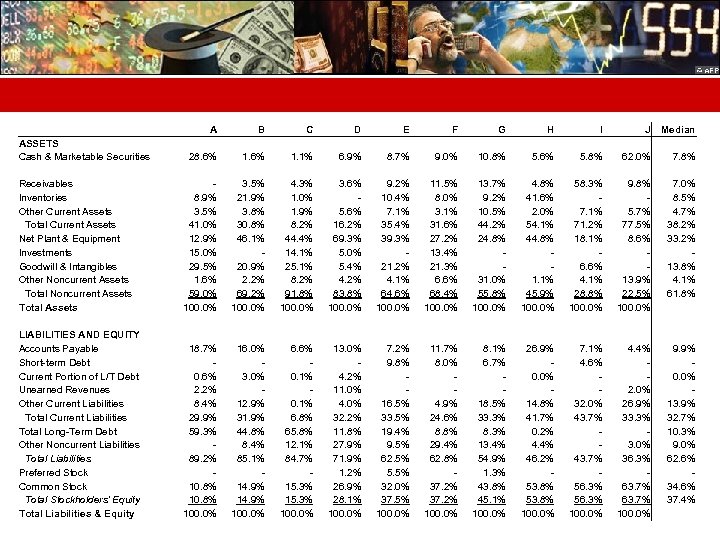 ASSETS Cash & Marketable Securities A Β C D Ε F G H I 28. 6% 1. 1% 6. 9% 8. 7% 9. 0% 10. 8% 5. 6% 5. 8% Receivables Inventories Other Current Assets Total Current Assets Net Plant & Equipment Investments Goodwill & Intangibles Other Noncurrent Assets Total Assets 8. 9% 3. 5% 41. 0% 12. 9% 15. 0% 29. 5% 1. 6% 59. 0% 100. 0% 3. 5% 21. 9% 3. 8% 30. 8% 46. 1% 20. 9% 2. 2% 69. 2% 100. 0% 4. 3% 1. 0% 1. 9% 8. 2% 44. 4% 14. 1% 25. 1% 8. 2% 91. 8% 100. 0% 3. 6% 5. 6% 16. 2% 69. 3% 5. 0% 5. 4% 4. 2% 83. 8% 100. 0% 9. 2% 10. 4% 7. 1% 35. 4% 39. 3% 21. 2% 4. 1% 64. 6% 100. 0% 11. 5% 8. 0% 3. 1% 31. 6% 27. 2% 13. 4% 21. 3% 6. 6% 68. 4% 100. 0% 13. 7% 9. 2% 10. 5% 44. 2% 24. 8% 31. 0% 55. 8% 100. 0% 4. 8% 41. 6% 2. 0% 54. 1% 44. 8% 1. 1% 45. 9% 100. 0% 58. 3% 7. 1% 71. 2% 18. 1% 6. 6% 4. 1% 28. 8% 100. 0% LIABILITIES AND EQUITY Accounts Payable Short-term Debt Current Portion of L/T Debt Unearned Revenues Other Current Liabilities Total Long-Term Debt Other Noncurrent Liabilities Total Liabilities Preferred Stock Common Stock Total Stockholders' Equity Total Liabilities & Equity 18. 7% 0. 6% 2. 2% 8. 4% 29. 9% 59. 3% 89. 2% 10. 8% 100. 0% 16. 0% 3. 0% 12. 9% 31. 9% 44. 8% 8. 4% 85. 1% 14. 9% 100. 0% 6. 6% 0. 1% 6. 8% 65. 8% 12. 1% 84. 7% 15. 3% 100. 0% 13. 0% 4. 2% 11. 0% 4. 0% 32. 2% 11. 8% 27. 9% 71. 9% 1. 2% 26. 9% 28. 1% 100. 0% 7. 2% 9. 8% 16. 5% 33. 5% 19. 4% 9. 5% 62. 5% 5. 5% 32. 0% 37. 5% 100. 0% 11. 7% 8. 0% 4. 9% 24. 6% 8. 8% 29. 4% 62. 8% 37. 2% 100. 0% 8. 1% 6. 7% 18. 5% 33. 3% 8. 3% 13. 4% 54. 9% 1. 3% 43. 8% 45. 1% 100. 0% 26. 9% 0. 0% 14. 8% 41. 7% 0. 2% 4. 4% 46. 2% 53. 8% 100. 0% 7. 1% 4. 6% 32. 0% 43. 7% 56. 3% 100. 0% J 62. 0% Median 9. 8% 5. 7% 77. 5% 8. 6% 13. 9% 22. 5% 100. 0% 4. 4% 2. 0% 26. 9% 33. 3% 3. 0% 36. 3% 63. 7% 100. 0% 7. 0% 8. 5% 4. 7% 38. 2% 33. 2% 13. 8% 4. 1% 61. 8% 7. 8% 9. 9% 0. 0% 13. 9% 32. 7% 10. 3% 9. 0% 62. 6% 34. 6% 37. 4%