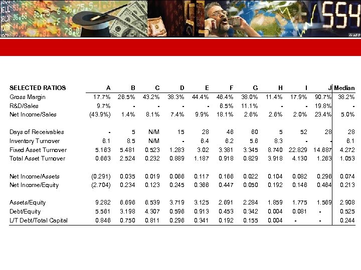 SELECTED RATIOS Gross Margin R&D/Sales Net Income/Sales A 17. 7% 9. 7% (43. 9%) Β 26. 5% 1. 4% C 43. 2% 8. 1% D 38. 3% 7. 4% Ε 44. 4% 9. 9% F 46. 4% 6. 5% 18. 1% G 38. 0% 11. 1% 2. 6% H 11. 4% 2. 6% I 17. 9% 2. 0% Days of Receivables Inventory Turnover Fixed Asset Turnover Total Asset Turnover 6. 1 5. 163 0. 663 5 8. 5 5. 481 2. 524 N/M 0. 523 0. 232 15 1. 283 0. 889 28 6. 4 3. 02 1. 187 46 6. 2 3. 381 0. 918 60 5. 6 3. 345 0. 829 5 8. 3 8. 740 3. 918 52 22. 829 4. 130 (0. 291) (2. 704) 0. 035 0. 234 0. 019 0. 123 0. 066 0. 245 0. 117 0. 366 0. 166 0. 447 0. 022 0. 050 0. 104 0. 192 0. 082 0. 146 9. 282 5. 561 0. 846 6. 696 3. 198 0. 750 6. 539 4. 307 0. 811 3. 719 0. 596 0. 296 3. 125 0. 913 0. 341 2. 691 0. 453 0. 192 2. 284 0. 342 0. 155 1. 859 0. 004 1. 775 0. 081 - Net Income/Assets Net Income/Equity Assets/Equity Debt/Equity L/T Debt/Total Capital J Median 90. 7% 38. 2% 19. 8% 23. 4% 5. 0% 28 28 6. 1 14. 687 4. 272 1. 263 1. 053 0. 296 0. 074 0. 464 0. 213 1. 569 2. 908 0. 525 0. 244