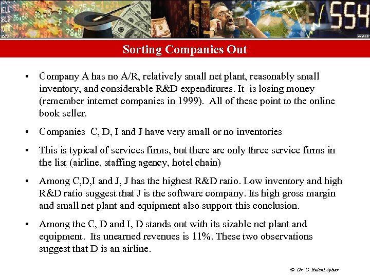 Sorting Companies Out • Company A has no A/R, relatively small net plant, reasonably small inventory, and considerable R&D expenditures. It is losing money (remember internet companies in 1999). All of these point to the online book seller. • Companies C, D, I and J have very small or no inventories • This is typical of services firms, but there are only three service firms in the list (airline, staffing agency, hotel chain) • Among C, D, I and J, J has the highest R&D ratio. Low inventory and high R&D ratio suggest that J is the software company. Its high gross margin and small net plant and equipment also support this conclusion. • Among the C, D and I, D stands out with its sizable net plant and equipment. Its unearned revenues is 11%. These two observations suggest that D is an airline. © Dr. C. Bulent Aybar