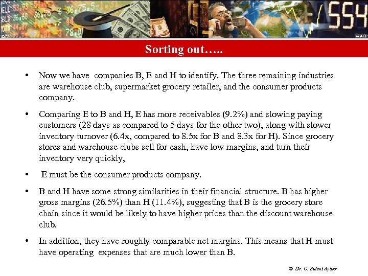 Sorting out…. . • Now we have companies B, E and H to identify. The three remaining industries are warehouse club, supermarket grocery retailer, and the consumer products company. • Comparing E to B and H, E has more receivables (9. 2%) and slowing paying customers (28 days as compared to 5 days for the other two), along with slower inventory turnover (6. 4 x, compared to 8. 5 x for B and 8. 3 x for H). Since grocery stores and warehouse clubs sell for cash, have low margins, and turn their inventory very quickly, • E must be the consumer products company. • B and H have some strong similarities in their financial structure. B has higher gross margins (26. 5%) than H (11. 4%), suggesting that B is the grocery store chain since it would be likely to have higher prices than the discount warehouse club. • In addition, they have roughly comparable net margins. This means that H must have operating expenses that are much lower than B. © Dr. C. Bulent Aybar