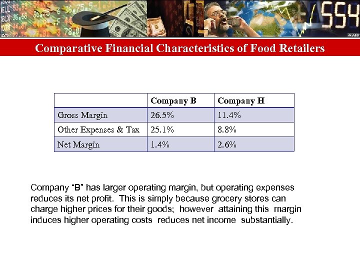 Comparative Financial Characteristics of Food Retailers Company B Company H Gross Margin 26. 5% 11. 4% Other Expenses & Tax 25. 1% 8. 8% Net Margin 1. 4% 2. 6% Company “B” has larger operating margin, but operating expenses reduces its net profit. This is simply because grocery stores can charge higher prices for their goods; however attaining this margin induces higher operating costs reduces net income substantially.