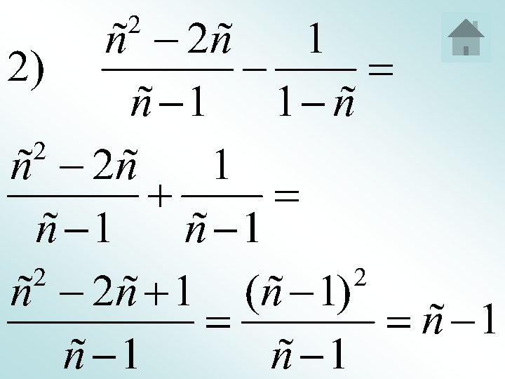 Рівняння, що є сумою двох і більше дробів 1 -й спосіб • Перенести всі члени рівняння в одну частину. • Привести рівняння до виду отриманого рівняння. і знайти корені 2 -й спосіб Назад в меню Приклад • Знайти О. Д. З. рівняння. • Помножити обидві частини рівняня на спільний знаменник дробів і отримати ціле рівняння. • Знайти корені отриманого рівняння і перевірити О. Д. З.