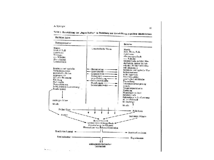 50 ies • Europe: Halbstarke / Teddy Boys / Blousons Noirs / Teenyboppers etc. Sozialer Hintergrund: überwiegend Grundschicht; aber auch Mittelklasse. Music: Rock & Roll Drugs: Alkohol • USA: Beatniks – Bohemistisch stilisierte Subkultur: Symbol, Stil und Interesen: reisen, fernöstliche Philosophy und Religion ( Zen und Sufismus); multikultureller Kleidungstil; Sozialer Hintergrund: überwiegend Mittelschicht, aber auch Grundschicht - „klassenlose Bohemestruktur“; viele Immigranten; kreativ, produktiv, : Musik: Jazz (Be. Bop; Hard Bop) Drogen: multipler Gebrauch-Cannabis, Hallucinogene, Alkohol, Heroin, Amphetamine. .
