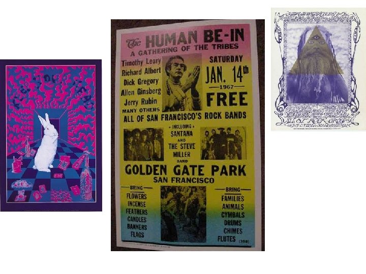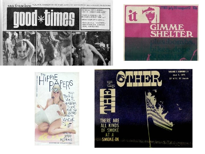 Die Gegenkultur • Hippies: Stil, Symbole und Ausdrucksverhalten : Flowers (Flower power, Flower Children), Räucherstäbchen, Ketten, eklektische Kleidung und Schmuck aus verschiedenen Kulturen; mystische Intetressen; alternative Lebensforman. Pazifistisch, optimistisch und missionaristisch. Auf der Suche nach neuen Lebensformen (Utopiates) und nach sexueller Freiheit. Soziale herkunft: überwiegend Mittelklassse • Musik: Folk, Rock, Einflüsse von fernöstlicher Musik; fusion. • Drogen: Cannabis, Halluzinoge; Tendenz zu Mischgebrauch. Drogengebrauch dient der Suche nach neuen Erfahrungen und Grenzüberschreitungen/Entgrenzungen.