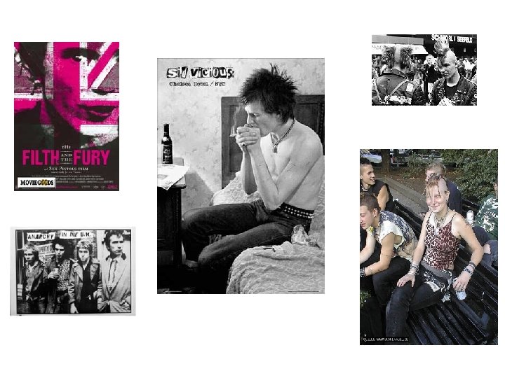 70 -ies: Punk • Stil, Symbole und Ausdrucksverhalten : extreme Stilbildung bzgl. Haartracht und Kleidung. Bricolage; Übertreibung, Ästhetisierung und Fetischisierung der Armut, der Hässlichkeit, der sexuellen Abweichung und einer unterprivilegierten sozialen Herkunft. Transvestitische Tendenzen bzgl. Kleidung und Stilisierung. Der soziale Hintergrund muss vorsichtig interpretiert werden. Punk in den USA und in Europa ist ein sehr verschiedenes Phänomen. In Europa überwiegend Arbeiterklasse, abe starke Beziehungen zur (ev. deklassierten) Mittelklasse und zu traditionellen Bohemestrukturen. Politische Einstellung: eher links/v. a. antifaschistisch; anarchistisch. • Musik: Punk, Reggae, Heavy Metal. • Drogen: Schnüffelstoffe (Sniffing glue), Alkohol, Stimulanzien, später Cannabis und Opiate.