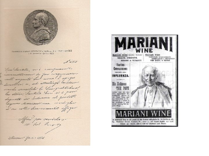 Ein Produkt für die Eliten • Der Vin Mariani wurde zu einem beliebten Konsumgut. Wir kennen die Verbreitungswege nicht genau, offenkundig fanden jedoch hochstehende und anerkannte Persönlichkeiten aus Adel, Klerus, dem Militär, der Wissenschaft, der Medizin, der Gesellschaft und den Künsten Gefallen an dem Produkt. Den Stellungnahmen ist zu entnehmen, dass sein Gebrauch einer Art „Doping“ entsprach. • Am 2. Jänner 1898 erhielt Mariani ein goldenes Verdienstabzeichen des Vatikan.