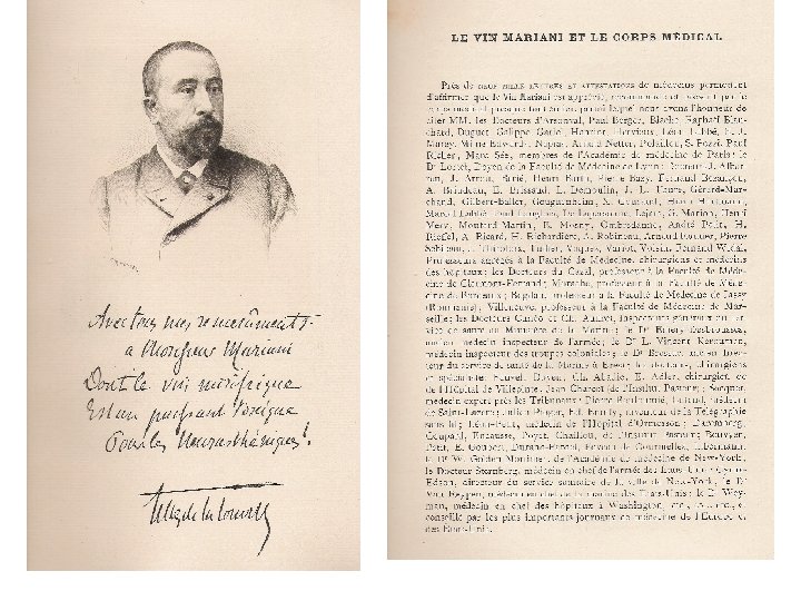 Das Album Mariani • Mariani gab Jahrbücher heraus, in denen berühmte Persönlichkeiten ihre Dankbarkeit für seine Produkte zum Ausdruck brachten: • 1. Jahrgang: Rodin; Zola; Massenet; Gounod; Edison • 4. Jahrgang: Papst Leo XIII, Präsident der USA Mc. Kinley; Henrik Ibsen; Edmond Rostand; Octave Mirbeau; Rachilde; Alphonse Mucha • 6. Jahrgang: Der Schah von Persien; Die Mediziner Gilles de la Tourette; Paul Richer(Mitarbeiter von Charcot); Voisin(Neurologe); weiters z. B. : Lumiere