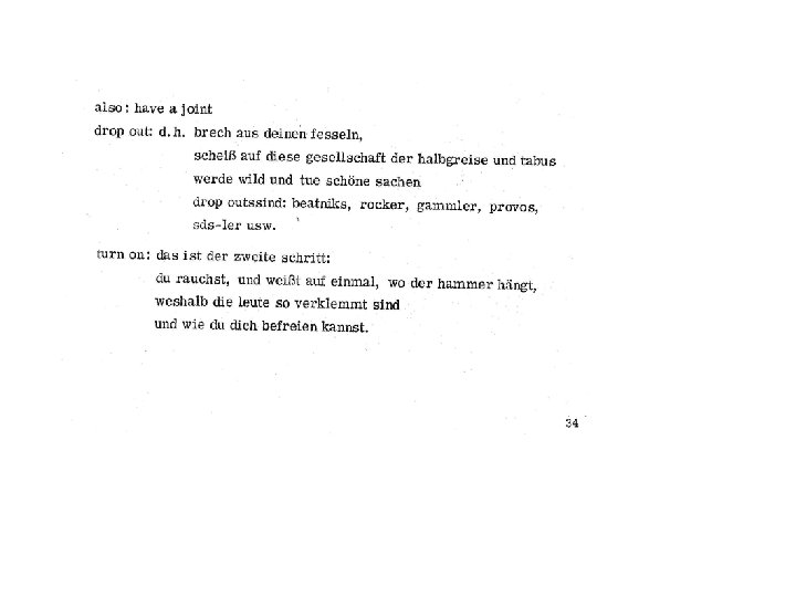 60 -ies into 70 ies • Gammler (europäische Variante der Beatniks): Stil, Symbole und Ausdrucksverhalten: eklektisch; Übernahme von Symbolen verschiedner Jugendkulturen; exotistisch; reiseorientiert; künstlerische Interessen. Sozialer Hintergrund: gemischt, Mittelstand relativ häufig vertreten; • Musik: Folklore, Rock, Jazz, Pop. • Drogen: Polydrug use. Cannabis, Halluzinogene, Stimulanzien, Beruhigungsmittel, Opium, später auch Opiate (heroin)