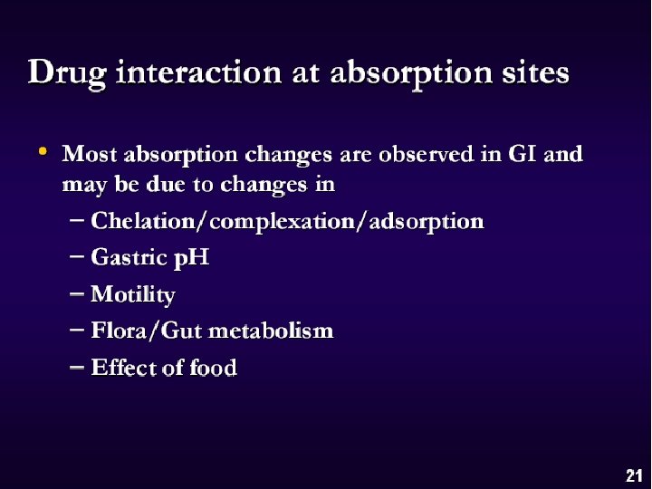 Pharmacokinetic Drug Interactions : Absorption Alteration Drug binding in GI tract GI motility GI p. H GI flora Action Iron may chelate ciprofloxacin, resulting in decreased absorption Increased GI motility caused by metoclopramide may decrease cefprozil absorption GI alkalinization by omeprazole may decrease absorption of ketoconazole Decreased GI bacterial flora caused by an antibiotic admin could decrease bacterial production of vitamin K augmenting anticoagulant effect of warfarin MAO in the wall of GI tract may be inhibited by MAO Drug metabolism in wall inhibitors resulting in increased blood pressure to of intestine phenylephrine