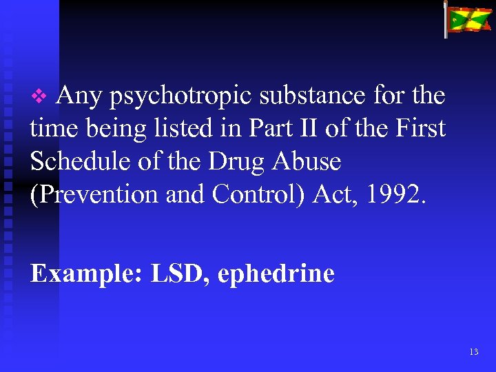 Any psychotropic substance for the time being listed in Part II of the First Schedule of the Drug Abuse (Prevention and Control) Act, 1992. Example: LSD, ephedrine 13
