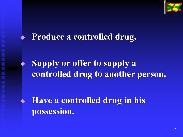 u u u Produce a controlled drug. Supply or offer to supply a controlled drug to another person. Have a controlled drug in his possession. 17