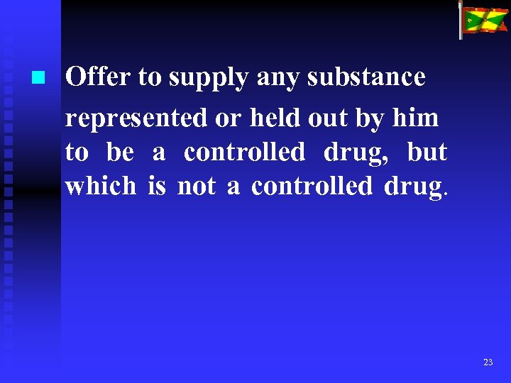 No person shall: n Supply any substance represented or held out by him to be a controlled drug, by which is not a controlled drug. 22