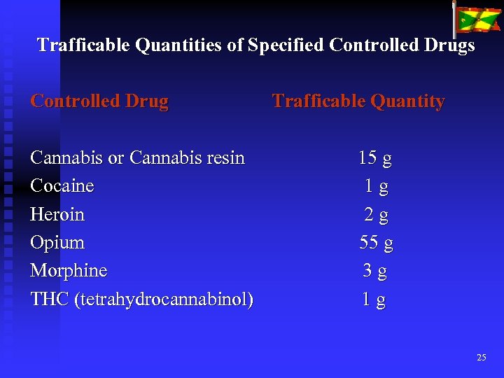Trafficable Quantities of Specified Controlled Drugs Controlled Drug Trafficable Quantity Cannabis or Cannabis resin 15 g Cocaine 1 g Heroin 2 g Opium 55 g Morphine 3 g THC (tetrahydrocannabinol) 1 g 25