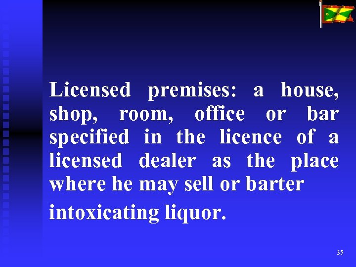 Licensed premises: a house, shop, room, office or bar specified in the licence of a licensed dealer as the place where he may sell or barter intoxicating liquor. 35