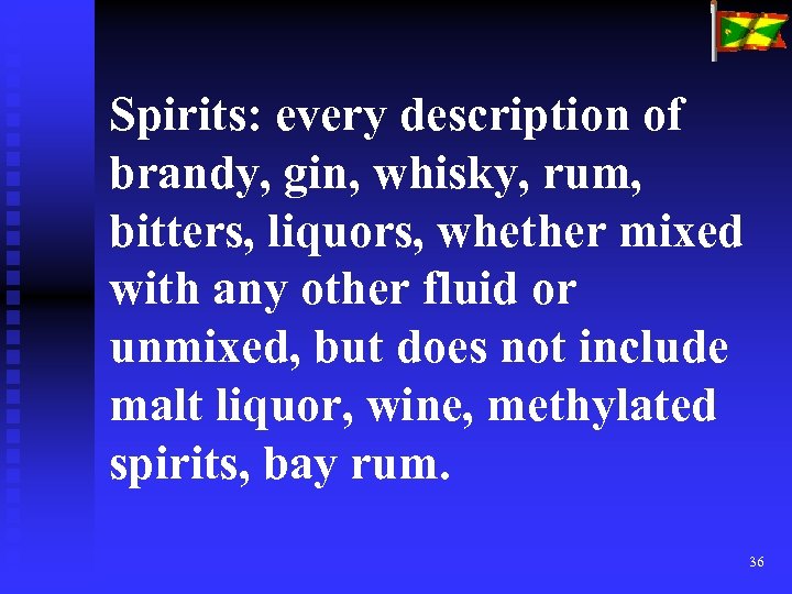 Spirits: every description of brandy, gin, whisky, rum, bitters, liquors, whether mixed with any other fluid or unmixed, but does not include malt liquor, wine, methylated spirits, bay rum. 36