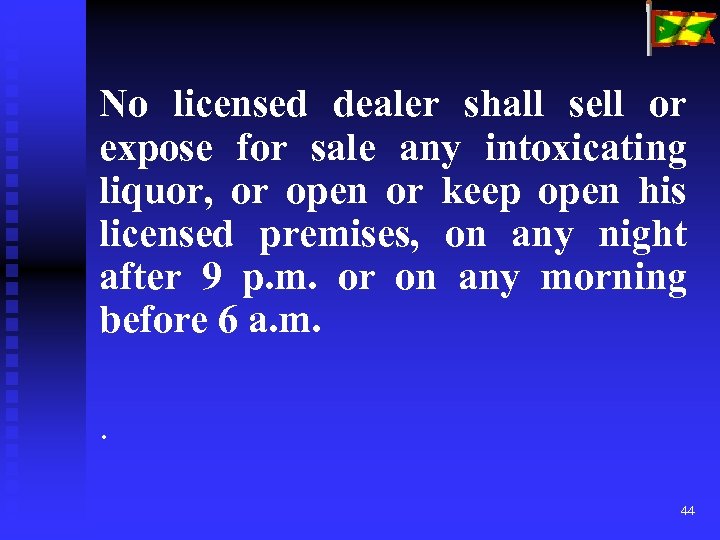 No licensed dealer shall sell or expose for sale any intoxicating liquor, or open or keep open his licensed premises, on any night after 9 p. m. or on any morning before 6 a. m. . 44