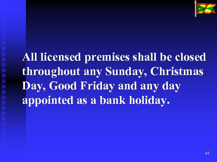 All licensed premises shall be closed throughout any Sunday, Christmas Day, Good Friday and any day appointed as a bank holiday. 45