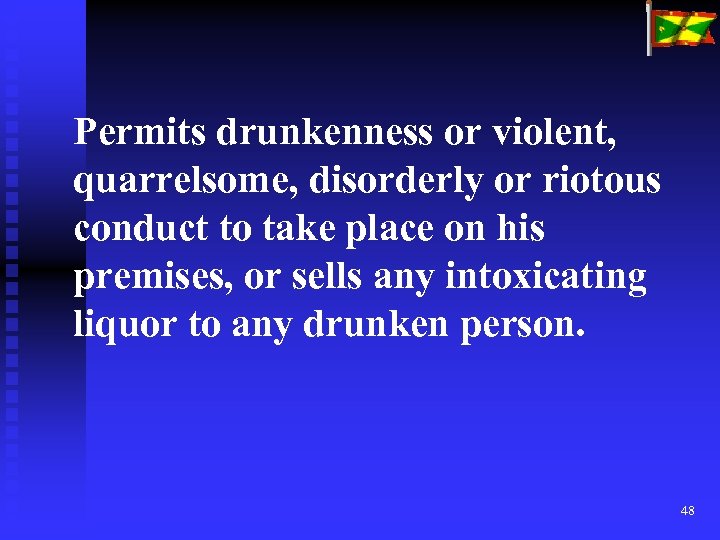 Permits drunkenness or violent, quarrelsome, disorderly or riotous conduct to take place on his premises, or sells any intoxicating liquor to any drunken person. 48