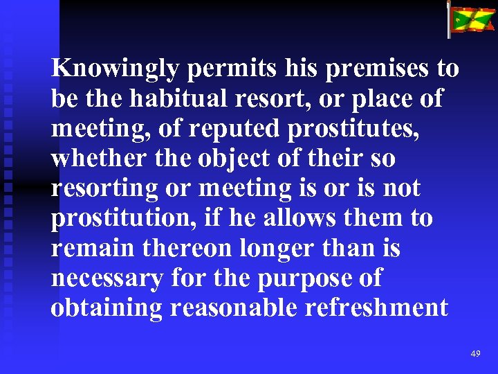 Knowingly permits his premises to be the habitual resort, or place of meeting, of reputed prostitutes, whether the object of their so resorting or meeting is or is not prostitution, if he allows them to remain thereon longer than is necessary for the purpose of obtaining reasonable refreshment 49