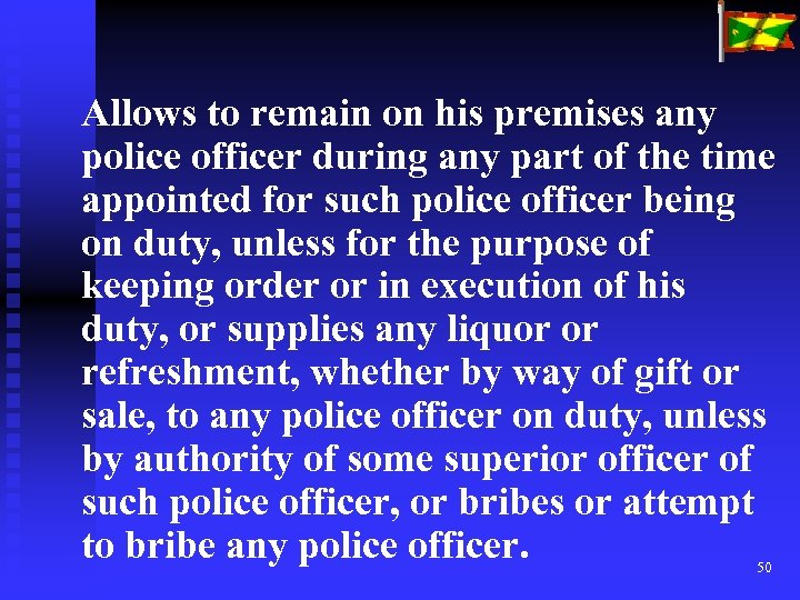Allows to remain on his premises any police officer during any part of the time appointed for such police officer being on duty, unless for the purpose of keeping order or in execution of his duty, or supplies any liquor or refreshment, whether by way of gift or sale, to any police officer on duty, unless by authority of some superior officer of such police officer, or bribes or attempt to bribe any police officer. 50
