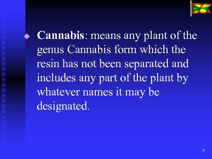 u Cannabis: means any plant of the genus Cannabis form which the resin has not been separated and includes any part of the plant by whatever names it may be designated. 8