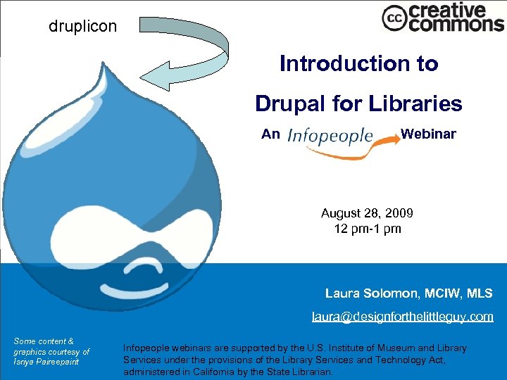 druplicon Introduction to Drupal for Libraries An Webinar August 28, 2009 12 pm-1 pm Laura Solomon, MCIW, MLS laura@designforthelittleguy. com Some content & graphics courtesy of Isriya Paireepairit Infopeople webinars are supported by the U. S. Institute of Museum and Library Services under the provisions of the Library Services and Technology Act, administered in California by the State Librarian.