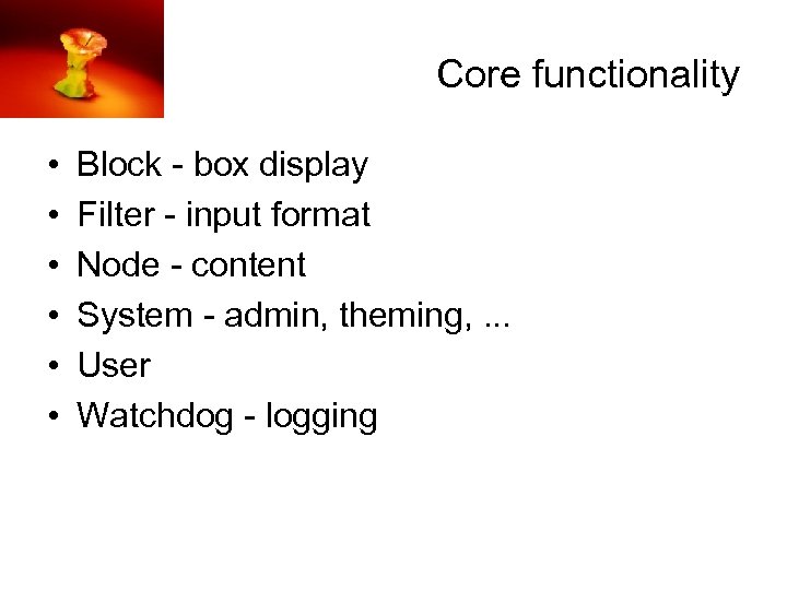Core functionality • • • Block - box display Filter - input format Node - content System - admin, theming, . . . User Watchdog - logging